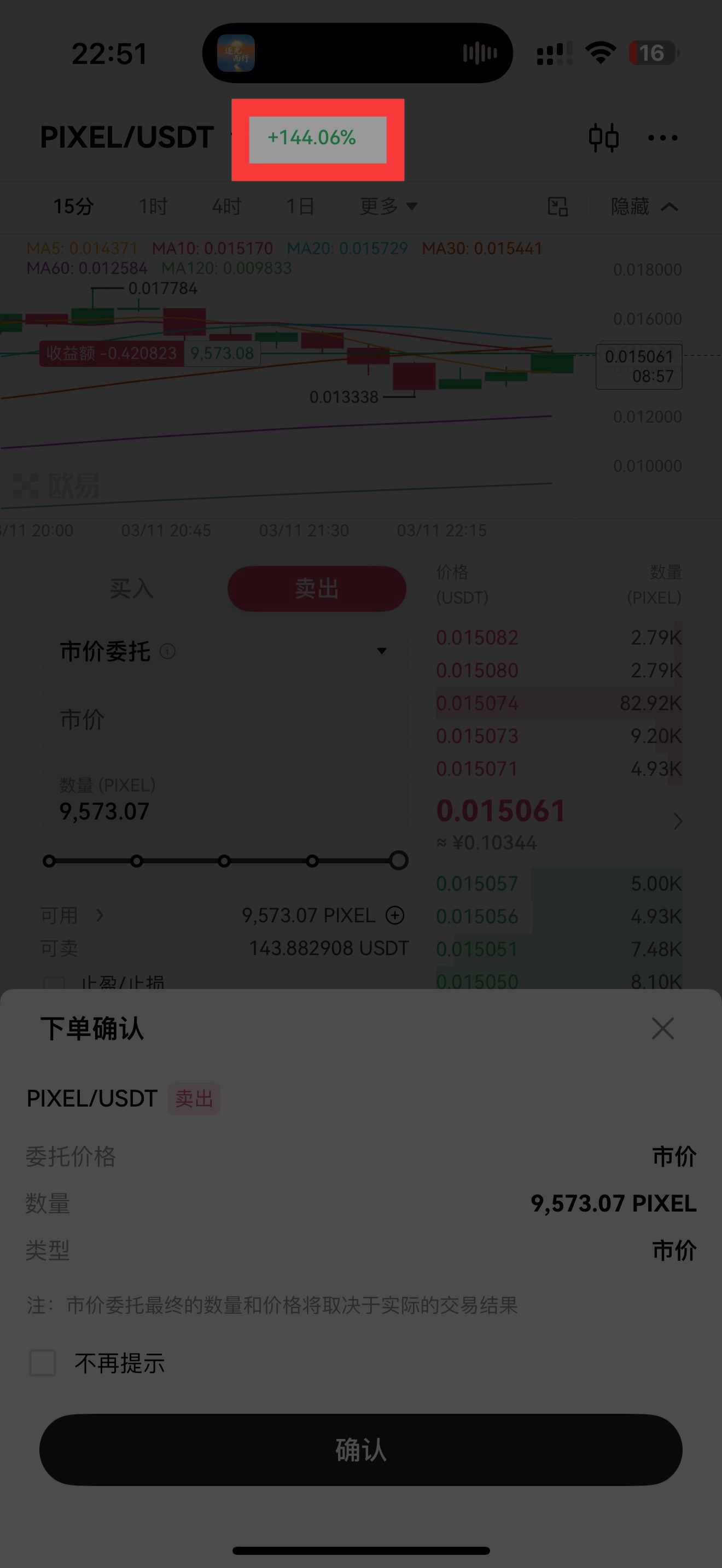 最最关键的来了:新人注册做完任务可以获得100USDT的奖励,也就是680多米。炒币的时候一定要注意看涨停,如果涨的比较快,再买入,如果开始下跌,就赶紧卖出,这玩意和炒股道理一样,要懂得见好就收!因为我们炒的是现货,所以可以根据涨幅来赚差价,每次涨到最高点开始下跌的时候一定要卖出,等跌到最低点不再下跌的时候再买入,以此类推,每次赚几个百分点就收,这样最稳妥。当然也有暴涨的时候,下边是我遇到的一次,足足赚了本金的一倍。
